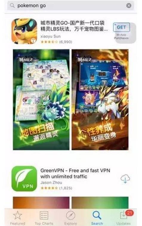 但当他们兴奋的拿出手机进行搜索时,却发现《PG》在国内苹果应用商店里没有上架。至此,国内的玩家则分成了两派,一部分人通过自有渠道玩上了《PG》,还有一部分人则投身于另一款游戏,因为在“Pokémon Go”的搜索结果里,它排名第一。(本文将主要针对苹果应用商店展开分析,部分安卓应用商店已经可以通过下载PG,并加上VPN软件来体验游戏了。)