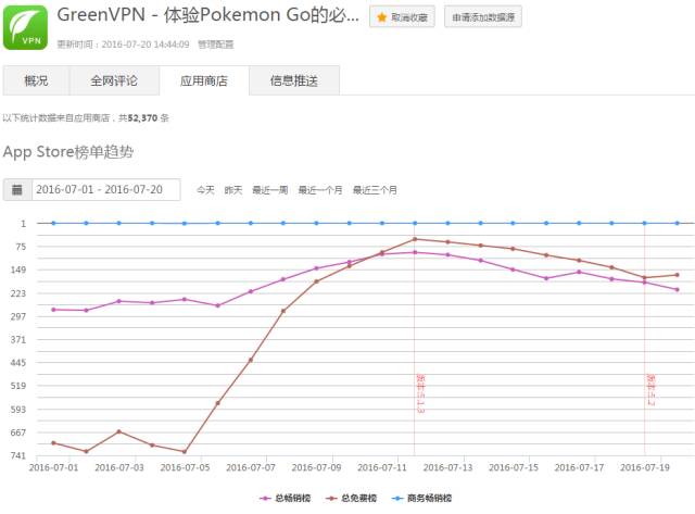GreenVPN在7月1日时,还是一个位于总免费榜700多名的一个普普通通的小工具,但随着《PG》的上线,它的名次也被逐渐带了起来,而在7月12日,GreenVPN在新版本中做了一个小改变,直接把自己带到了榜单位置的最高点:免费榜52名。