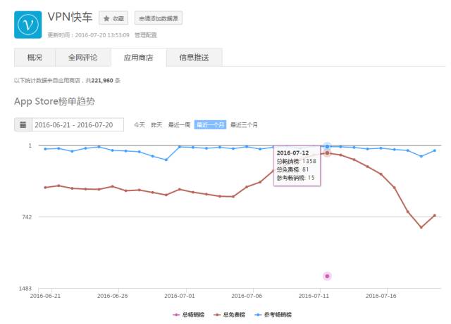 借《PG》的东风到底有多大的影响呢?参考一下另一款VPN软件便知。VPN快车在7月1日时位于免费榜的458位,比GreenVPN还高一些。和GreenVPN一样,这款产品也受到了《PG》的影响,在热潮来袭时排名迅速拔高,一样在7月12日达到了最高点免费榜81名。