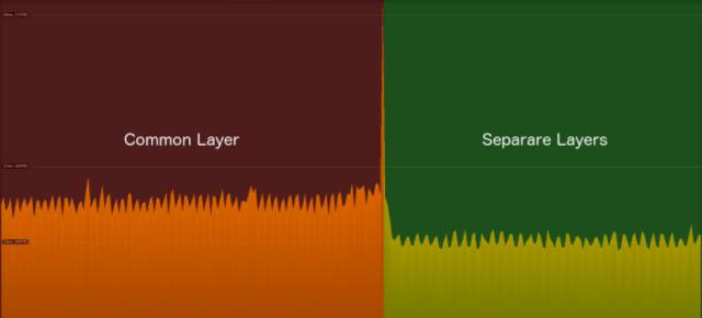 正如在分析器中所观察到数据情况,两个测试对于物理计算上的CPU消耗截然不同。使用相同层平均消耗约27.7毫秒,不同层平均消耗约17.6毫秒。