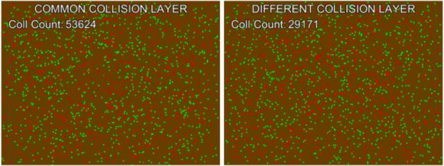 在Demo的其中一个测试中,所有物体的层都设为Default,然后通过比较碰撞监听函数中不同游戏对象的标签字符串来判断是否进行交互。而在另一个测试中,每种颜色的物体都位于单独的层,然后设置碰撞矩阵来定义层间的交互。这样就不需进行字符串比较了,碰撞只会发生在正确的层上。