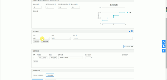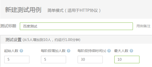5、 首先点击压测产品首页中的快捷入口:HTTP直压。模式选择简单模式,名称和描述可以自己填写。(图中示例起始人数5人,每隔30秒增加5人,加到10人为上限)