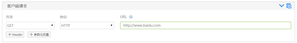 6、新建一个客户端请求,方法选择GET,填写想要测试的URL,URL变量和Header变量这里可以暂且不填。(注:填写Header信息或修改参数化变量可以满足更高要求的测试场景,具体可以查看更一步的帮助,在本篇中不作展开)