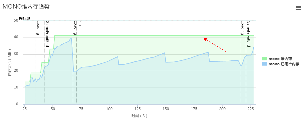 如下图,我们可以看到内存峰值的超标线,如果超过,那么那一刻你的游戏极有可能出现上述“闪退”,“卡顿”和“系统重启”的现象了;如果没有超过,那么恭喜你,继续进入下一个关卡,检查你的游戏是否存在内存泄漏的现象。