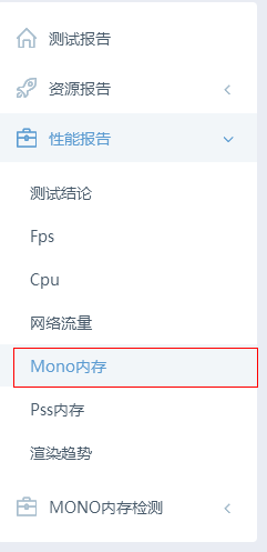 如果需要更加详细的指标情况,可以选择“性能报告”部分中的“mono内存”: