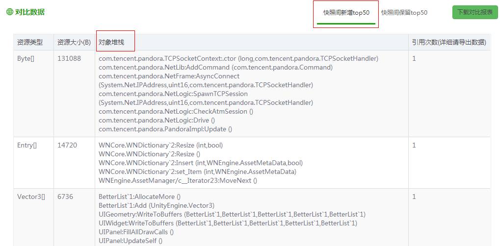 点击之后会得到两个场景之间的内存分配比较,其中”对象堆栈“就代表游戏中实现的一个对象,以MOBA游戏为例,上图中的snapshot1和snapshot2所对应的两个场景可能就是“5V5战斗副本“和”游戏大厅“,通过右上角的”快照间新增top50“和”快照间保留top50“,我们可以了解到这两个不同的场景之间,哪些对象的资源被保留了,哪些对象的资源新增了(如果需要更多数据,可以点击右上角的”下载对比报表“),而这些行为是否是游戏程序所需要的。