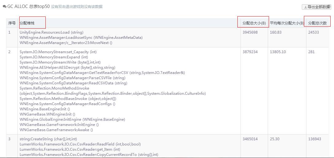 比如说,王者荣耀这类MOBA游戏在副本和游戏大厅之间,会保留地图和NPC的对象资源,保证下次开始游戏时可以更快的读取和进入游戏;而天天酷跑之类的跑酷游戏在在副本和游戏大厅之间,就不会保留地图和NPC的对象资源,原因就在于王者荣耀这类的MOBA游戏,地图和NPC的出现的情况是完全相同的,为了更好的游戏体验,保留对象资源是合适的;而天天酷跑之类的跑酷游戏,有不同的关卡副本,如果保留对象资源,会导致内存不断的被占用,因此选择不保留对象资源。因此我们可以说,内存分配是否合理没有绝对意义上的标准,都要游戏开发者根据自己的开发策略,结合mono内存检测的报告,判定内存分配的情况是否在自己的计划之中。重新刷新一下报告,我们最后来看一下游戏整体运行过程中具体功能的内存分配的情况: