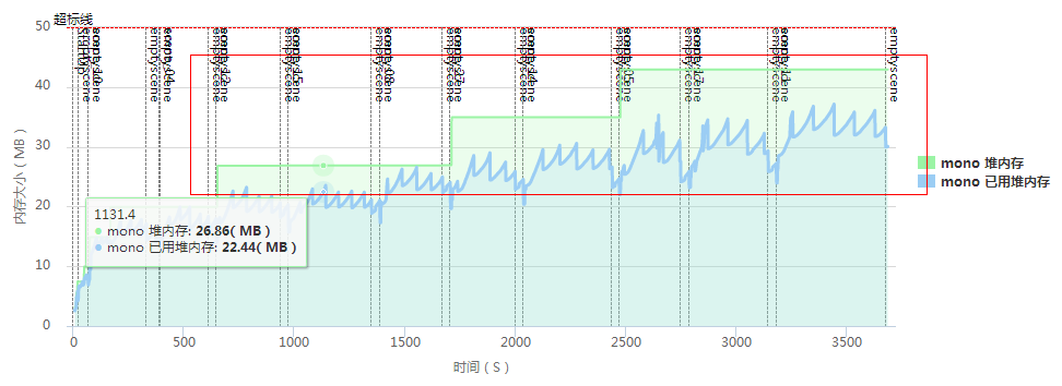 在比较合理的内存策略下,mono内存应该上升到一定阶段之后便不再变化,如下图: