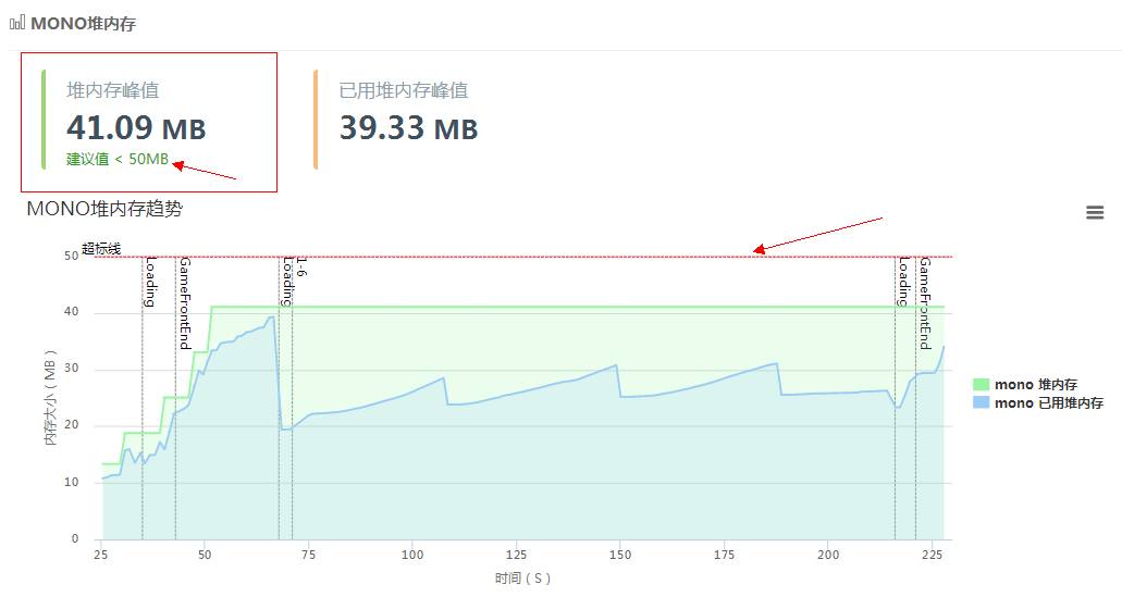 如果要对手游内存管理进行优化,首先要明确一个分析的策略,Cube团队的建议是看四块内容:要观察手游内存的整体表现,首先观察游戏的堆内存峰值是否超过了建议值,如下图: