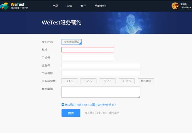 填写并提交预约信息。提交完毕后,工作人员会在1个工作日内联系您,沟通测试需求。