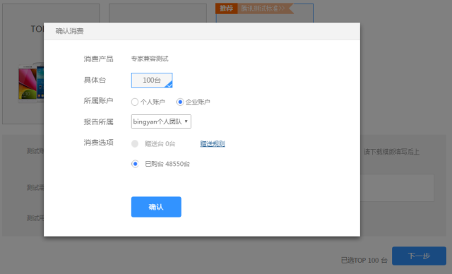 点击“下一步”进入确认消费页面,选择个人账户或企业账户,使用对应账户的额度对本次测试进行消费抵扣。