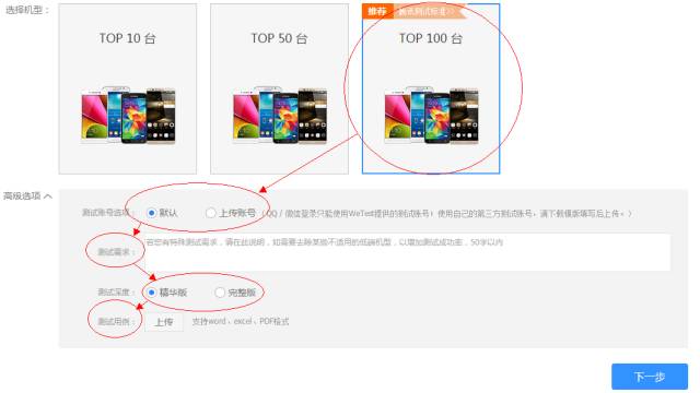 2.选择机型——平台默认选中Top100机型,也可以点选“随机50台”,或者“自选机型”