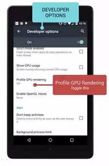 性能问题如此的麻烦,幸好我们可以有工具来进行调试。打开手机里面的开发者选项,选择Profile GPU Rendering,选中On screen as bars的选项。