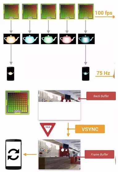 通常来说,帧率超过刷新频率只是一种理想的状况,在超过60fps的情况下,GPU所产生的帧数据会因为等待VSYNC的刷新信息而被Hold住,这样能够保持每次刷新都有实际的新的数据可以显示。但是我们遇到更多的情况是帧率小于刷新频率。