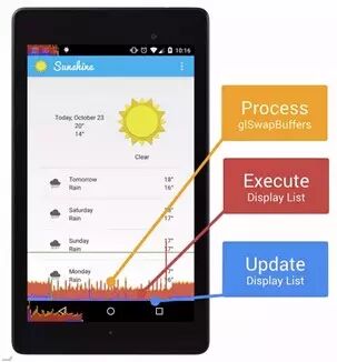 每一条柱状线都包含三部分,蓝色代表测量绘制Display List的时间,红色代表OpenGL渲染Display List所需要的时间,黄色代表CPU等待GPU处理的时间。