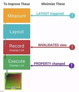 需要注意的是:任何时候View中的绘制内容发生变化时,都会重新执行创建DisplayList,渲染DisplayList,更新到屏幕上等一系列操作。这个流程的表现性能取决于你的View的复杂程度,View的状态变化以及渲染管道的执行性能。举个例子,假设某个Button的大小需要增大到目前的两倍,在增大Button大小之前,需要通过父View重新计算并摆放其他子View的位置。修改View的大小会触发整个HierarcyView的重新计算大小的操作。如果是修改View的位置则会触发HierarchView重新计算其他View的位置。如果布局很复杂,这就会很容易导致严重的性能问题。我们需要尽量减少Overdraw。