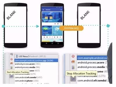 如果你发现在空白activity的内存快照中有一些可疑的没有被释放的对象存在,那么接下去就应该使用Alocation Track Tool来仔细查找具体的可疑对象。我们可以从空白activity开始监听,启动到观察activity,然后再回到空白activity结束监听。这样操作以后,我们可以仔细观察那些对象,找出内存泄漏的真凶。