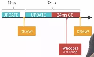 通常来说,单个的GC并不会占用太多时间,但是大量不停的GC操作则会显著占用帧间隔时间(16ms)。如果在帧间隔时间里面做了过多的GC操作,那么自然其他类似计算,渲染等操作的可用时间就变得少了。