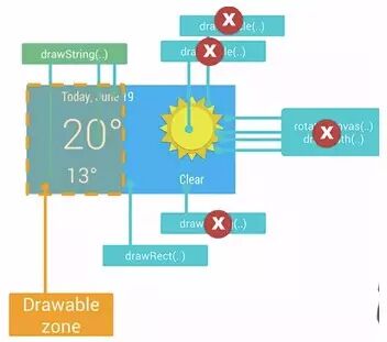 但是不幸的是,对于那些过于复杂的自定义的View(重写了onDraw方法),Android系统无法检测具体在onDraw里面会执行什么操作,系统无法监控并自动优化,也就无法避免Overdraw了。但是我们可以通过canvas.clipRect()来帮助系统识别那些可见的区域。这个方法可以指定一块矩形区域,只有在这个区域内才会被绘制,其他的区域会被忽视。这个API可以很好的帮助那些有多组重叠组件的自定义View来控制显示的区域。同时clipRect方法还可以帮助节约CPU与GPU资源,在clipRect区域之外的绘制指令都不会被执行,那些部分内容在矩形区域内的组件,仍然会得到绘制。