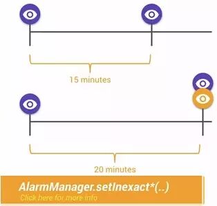 解决上面的问题,正确的方式可能是使用非精准定时器。通常情况下,我们会设定一个时间进行某个操作,但是动态修改这个时间也许会更好。例如,如果有另外一个程序需要比你设定的时间晚5分钟唤醒,最好能够等到那个时候,两个任务捆绑一起同时进行,这就是非精确定时器的核心工作原理。我们可以定制计划的任务,可是系统如果检测到一个更好的时间,它可以推迟你的任务,以节省电量消耗。