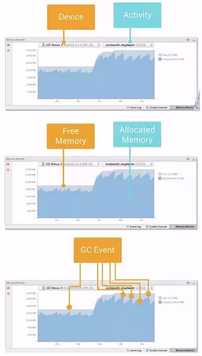 虽然Android有自动管理内存的机制,但是对内存的不恰当使用仍然容易引起严重的性能问题。在同一帧里面创建过多的对象是件需要特别引起注意的事情。
