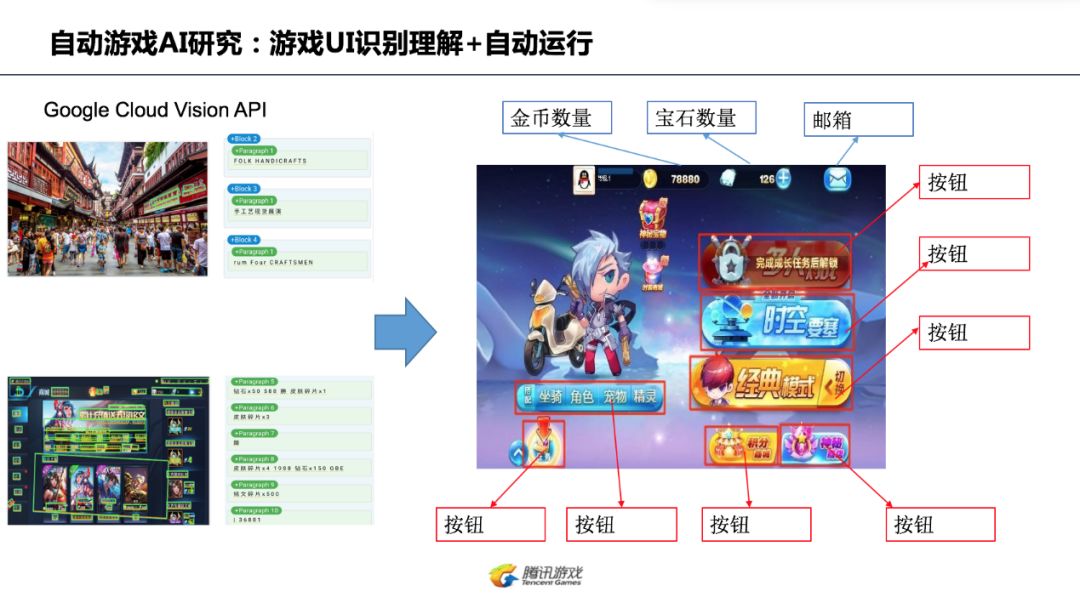 基于游戏领域,腾讯WeTest尝试通过OCR技术与AI结合的形式,进行有效场景探索与选择操作。通过在较为复杂的游戏场景中对游戏UI语义与图标分门别类进行理解识别、合并识别结果,来获得当前UI图像对应的可操作元素的名称及其位置,进而更加真实的探索场景。