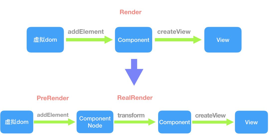 预渲染的方案修改了WeexFrameWork虚拟dom和Android控件树转换的部分,在预渲染时,不生成真正的component和view结构,用抽象出来的ComponentNode存储虚拟dom的操作,并在RealRender的时候将node转换成一个个component以及View。