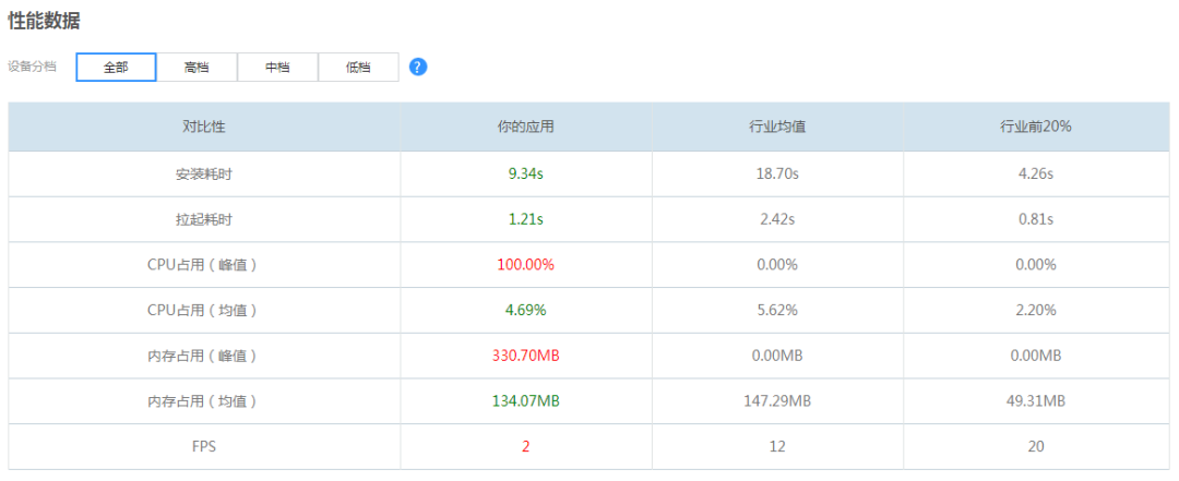 用户除了可以对比兼容性问题概况数据外,WeTest还整理出了设备性能数据的行业标准: