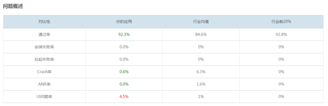 在对比报告页面里,WeTest对提测产品的通过率、安装失败率、拉起率、Crash率等数据和“行业均值”、“行业前20%”数据标准进行对比参照。