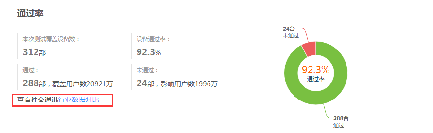 拿到深度兼容或专家兼容测试报告时,在问题概述通过率模块下方,会根自动显示查看某行业数据对比。只需点击蓝色字体“行业数据对比”,即可进入对比报告页面。