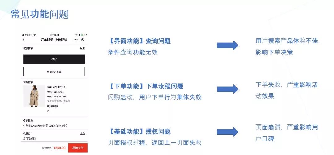 功能用例测试,主要验证的是用户通过C端提交请求,B端在在后台进行处理后返回信息,返回C端的信息是否与预期相同。针对智慧零售小程序,WeTest将功能问题分为三类: