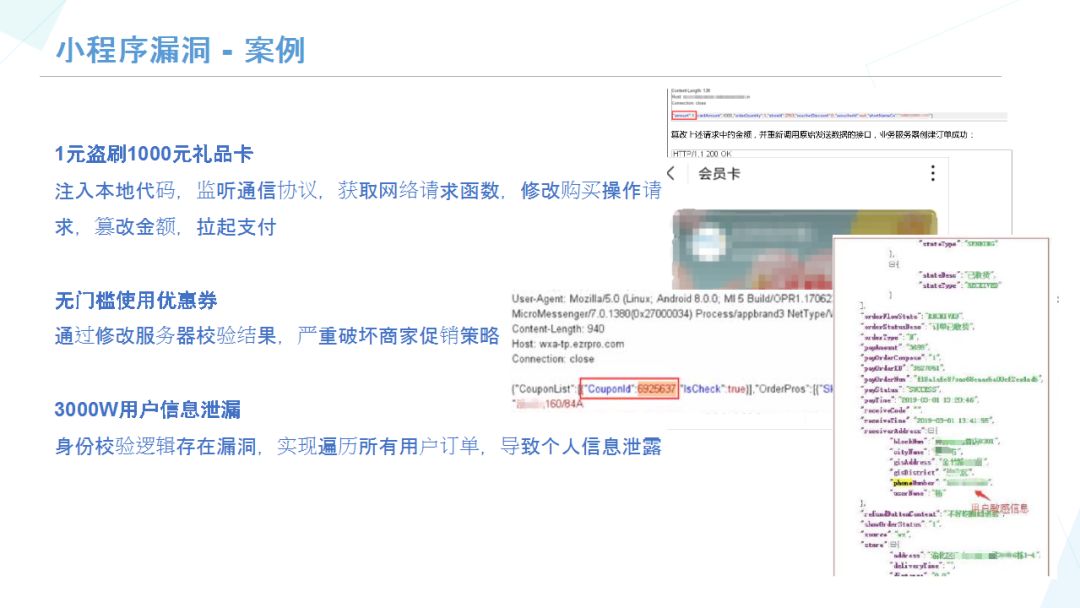 小程序业务服务器由厂商自行开发实现,是小程序体系中安全最薄弱环节,普遍存在业务安全漏洞,诸如用户信息泄露、优惠券盗刷、制造坏账订单、刷订单等;