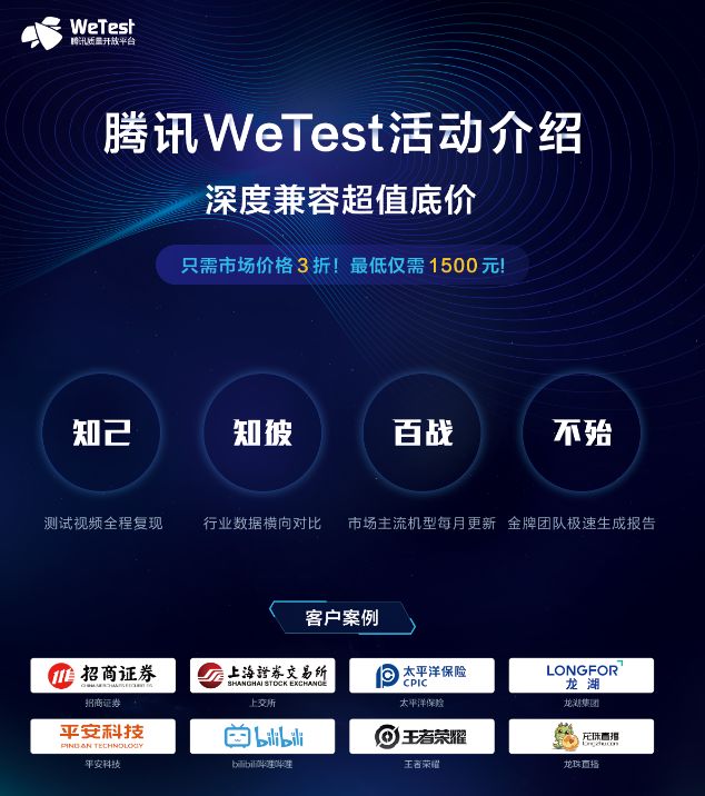 WeTest旨在打造一站式品质开放平台,向全球开发者提供兼容、性能、安全、舆情四大维度的品质保障能力,服务贯穿产品全生命周期。目前WeTest已经为金融、游戏、电商、视频、教育等近百行业提供服务支持。