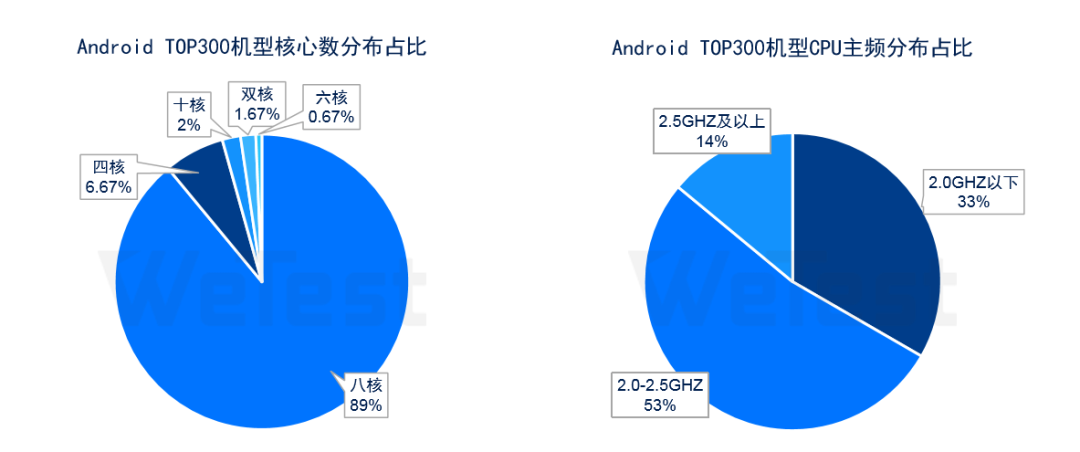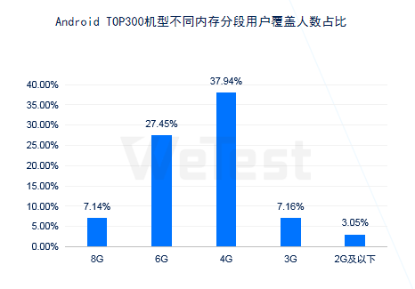 从白皮书我们可以看到,在2019年统计的TOP300机型中,以内存为划分依据,有37.94%的用户使用4GB机型,其次是6GB机型,而2GB及以下用户的覆盖数量仅为3%。其次,在TOP300机型中,4GB内存的机型数量占比高达42.3%,6GB内存机型和3GB内存机型占比分别为27.67%和13%,其中6GB机型2018年占比仅为17%,在2019年有了大幅度的提升。