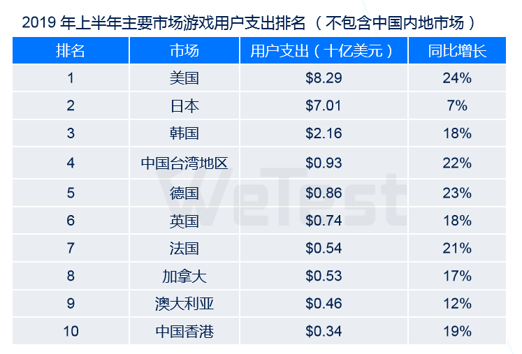 在整个《2019中国移动游戏质量白皮书》中,腾讯WeTest特意用一个章节的容量专门讲述了“出海专题报告”。在这份报告中我们可以看出,有三分之一的中国游戏公司有出海计划,中国手游海外用户支出占海外手游市场的份额达到了15.8%,其中用户支出最多的是欧美日韩地区,下载量呈大幅度增加的则是两印巴西俄罗斯。