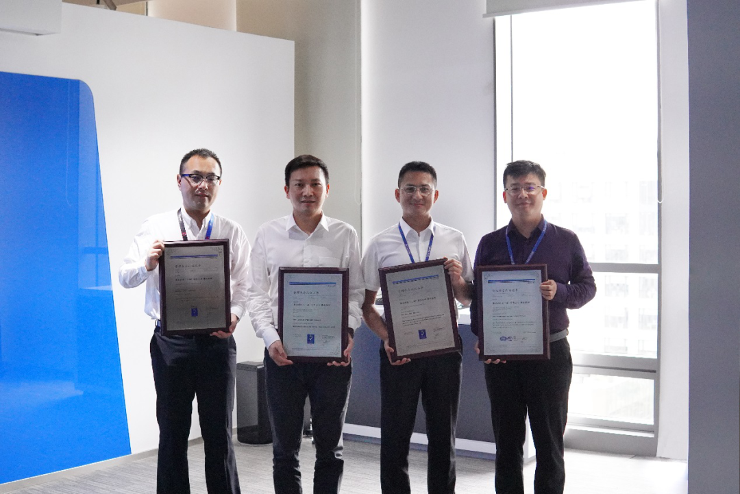 (腾讯互动娱乐事业群品质管理部总监方亮、腾讯WeTest产品中心总监殷柱伟、腾讯WeTest产品中心技术负责人孙大伟、张得俊代表腾讯WeTest接受DNV GL大中国区副总裁陈立颁发三项ISO国际认证证书)