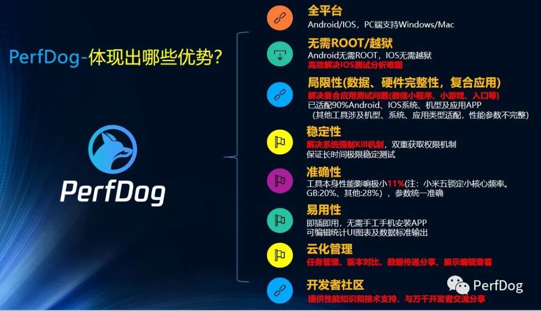 PerfDog是移动平台的性能测试工具,快速定位分析性能问题,提升APP应用及游戏性能和品质。手机无需ROOT/越狱,手机硬件、游戏及应用APP也无需做任何修改,极简化即插即用,是全网唯一同时支持iOS/Android/小程序/H5等移动全平台性能测试的工具。