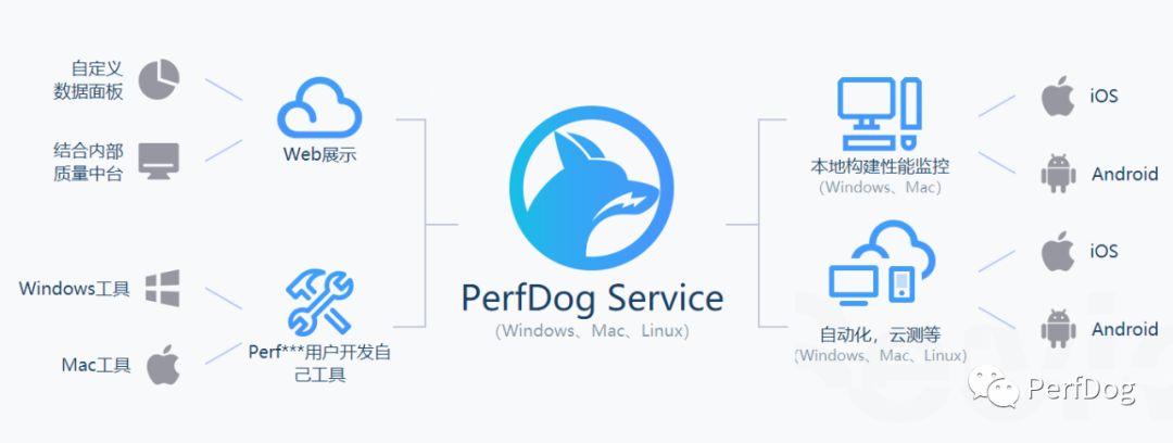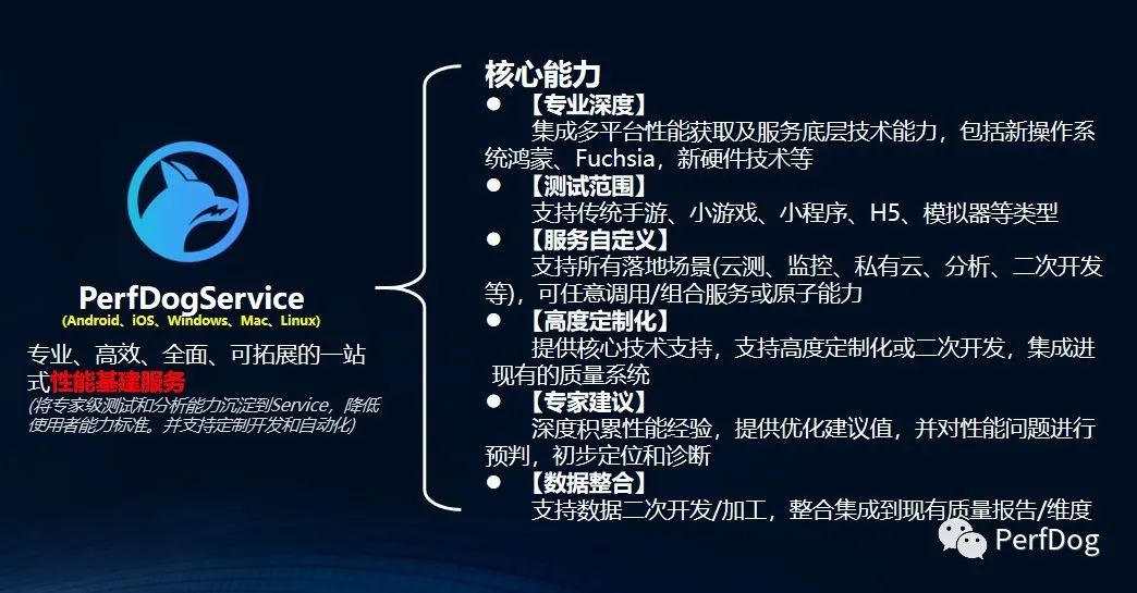 PerfDogService是PerfDog的服务组件,提供专业、高效、全面、可拓展的一站式性能基建服务。集成多平台性能获取及服务底层技术能力,未来还将支持鸿蒙、Fuchsia等新系统;支持传统手游、小游戏、小程序、H5、模拟器等类型;支持所有落地场景(云测、监控、私有云、分析、二次开发等),可任意调用/组合服务或原子能力;提供核心技术支持,支持高度定制化或二次开发,集成进现有的质量系统;深度积累性能经验,提供优化建议值,并对性能问题进行预判,初步定位和诊断;支持数据二次开发/加工,整合集成到现有质量报告/维度等。用户可基于service组件二次开发自己的PerfDog性能工具或自动化服务。