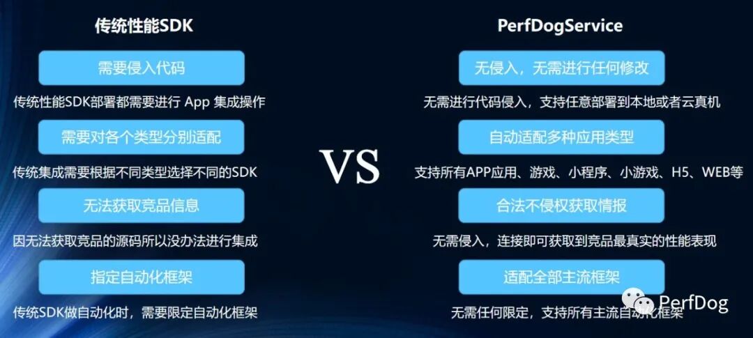 国内外其他相似的产品存在诸多问题,如涉及平台不兼容、需要越狱/root、性能影响较大、使用复杂、数据不准不全,特别是缺少iOS平台的测试数据。PerfDogService不存在上述问题,同时无需进行代码侵入,支持任意部署到本地或者云真机;支持所有APP应用、游戏、小程序、小游戏、H5、WEB等;无需侵入,连接即可获取到竞品最真实的性能表现;无需任何限定,支持所有主流自动化框架等。