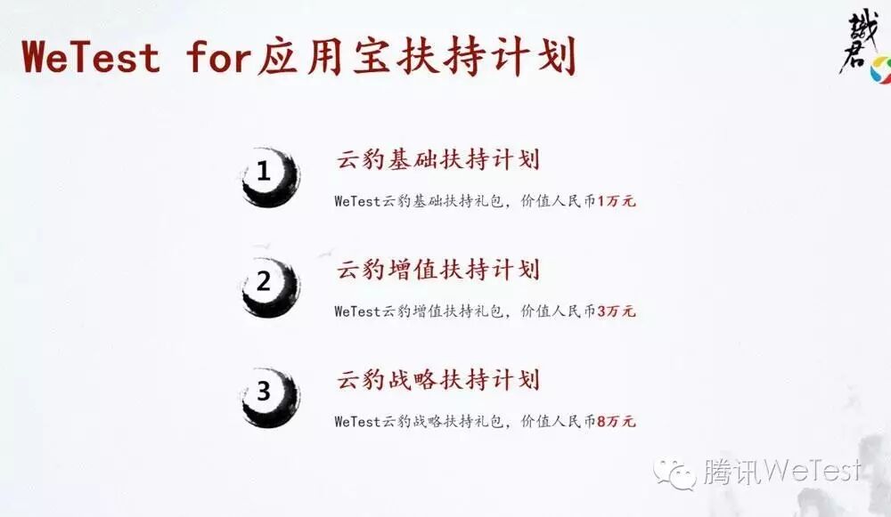 6月2日,腾讯WeTest参加应用宝在深圳主办的应用宝游戏合作伙伴沙龙,腾讯互娱研发部游戏质量总监方亮现场宣布WeTest和应用宝联合推出开发者扶持计划全面升级为“云豹计划”,在产品满足应用宝一定的产品评级后,WeTest的游戏开发者用户不仅可以获得腾讯WeTest专家的专业技术咨询指导支持,更有机会获得在腾讯互娱主办的线上线下活动中的交流机会。